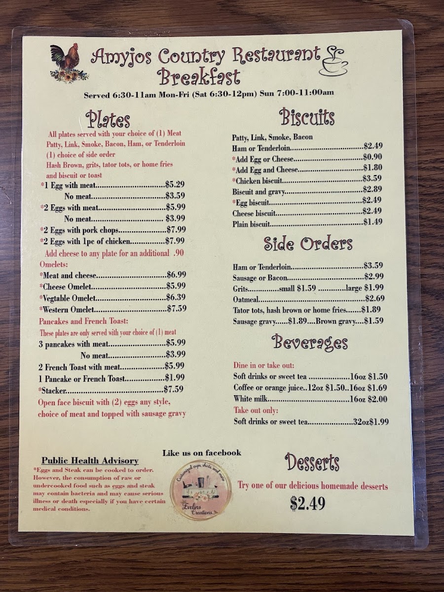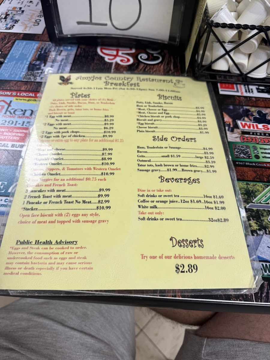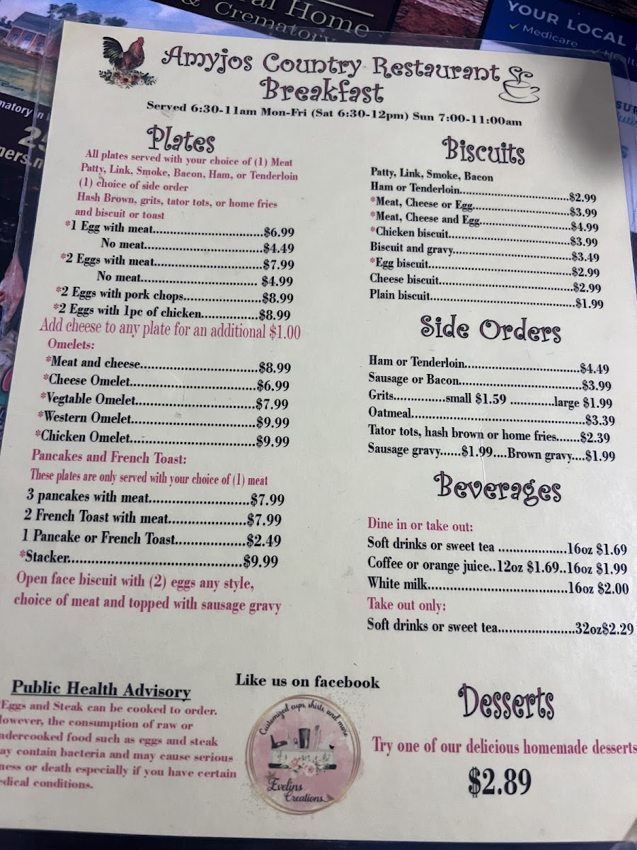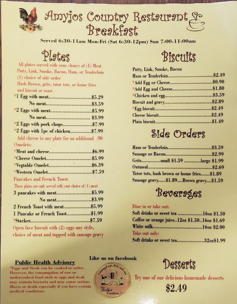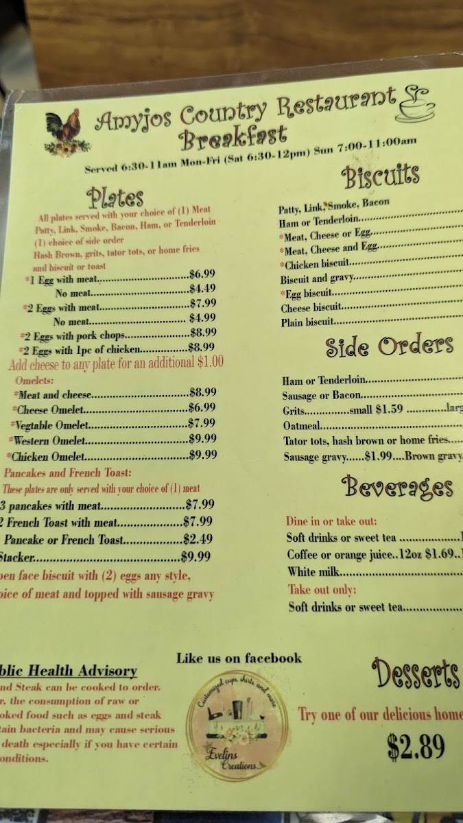Step into Amy Jo's Country Restaurant, where comfort food comes alive with every bite! Located at 4600 Nash St N, Wilson, NC 27896, our menu is a delightful journey through classic southern flavors that promise to satisfy your cravings. Don’t miss our mouthwatering Fried Chicken, perfectly crispy on the outside and tender on the inside, or indulge in our hearty Meatloaf Dinner, complemented by creamy Mashed Potatoes and savory Gravy. For a taste of nostalgia, try our Grilled Cheese Sandwich paired with a Hoop Cheese Biscuit – it’s the ultimate combination! Whether you’re in the mood for a Fried Pork Chop Dinner, a quintessential Jo Burger with the Works, or a comforting bowl of Grits and Eggs, you’ll find something to love. And for a sweet finish, our Watergate Salad is a must-try. Come enjoy home-cooked goodness with us!