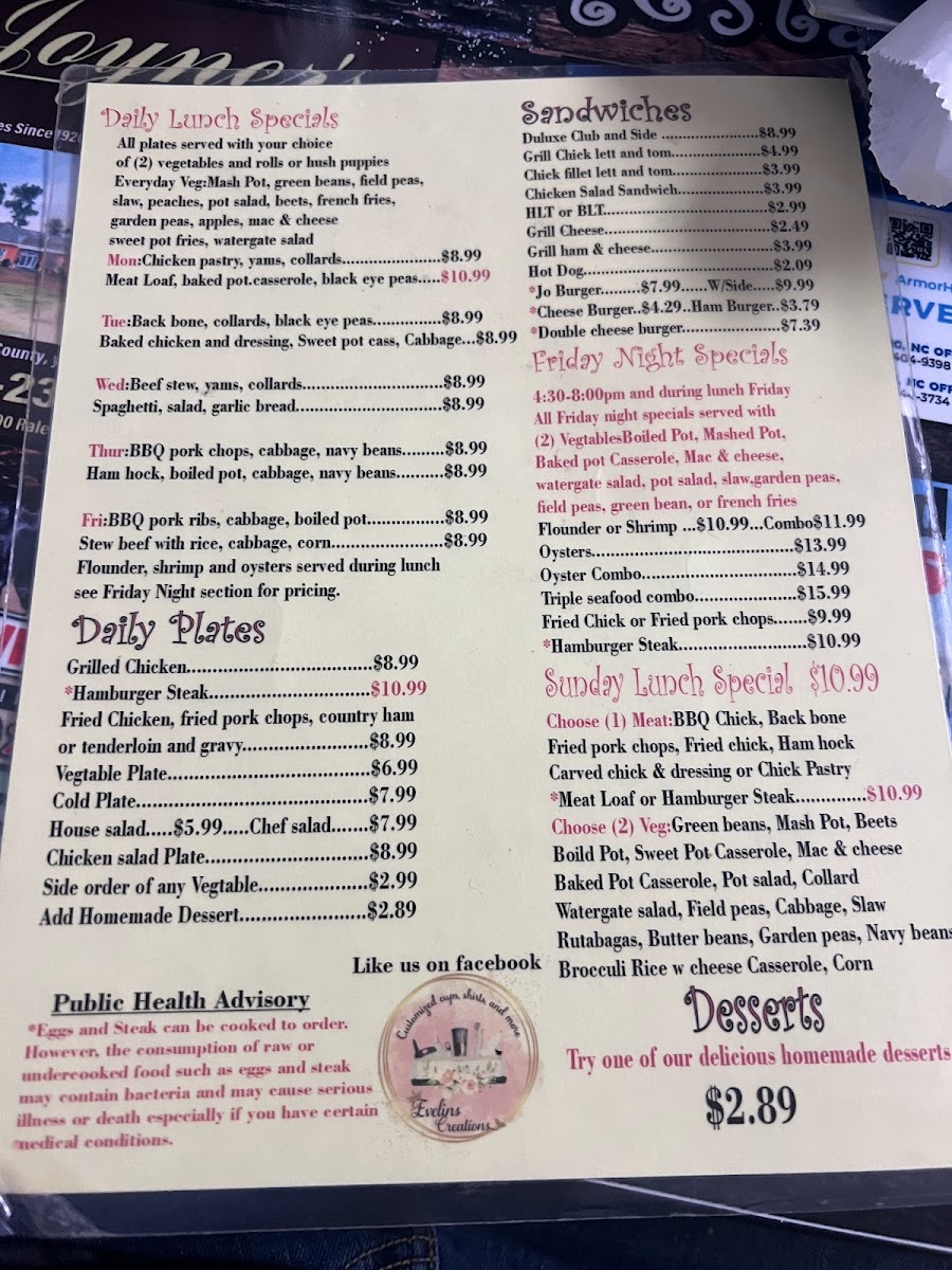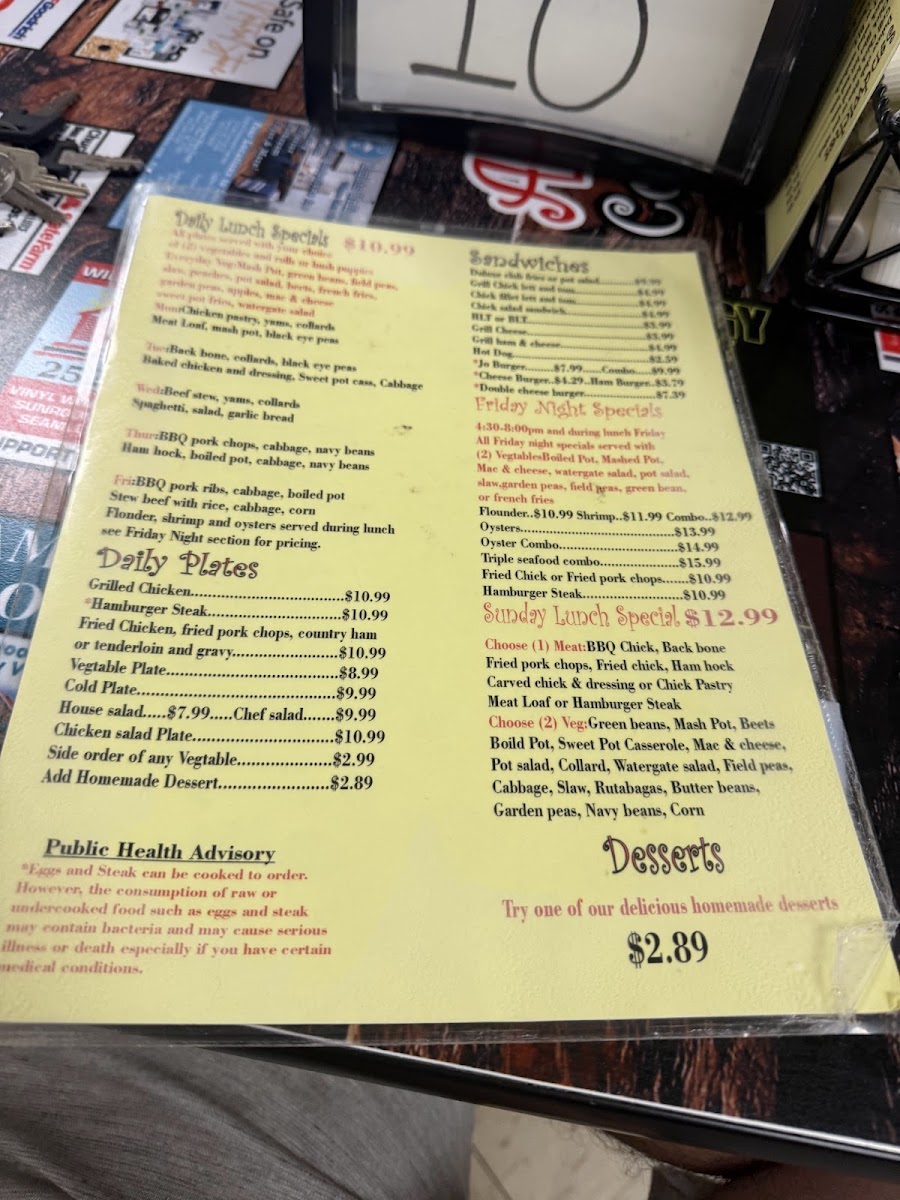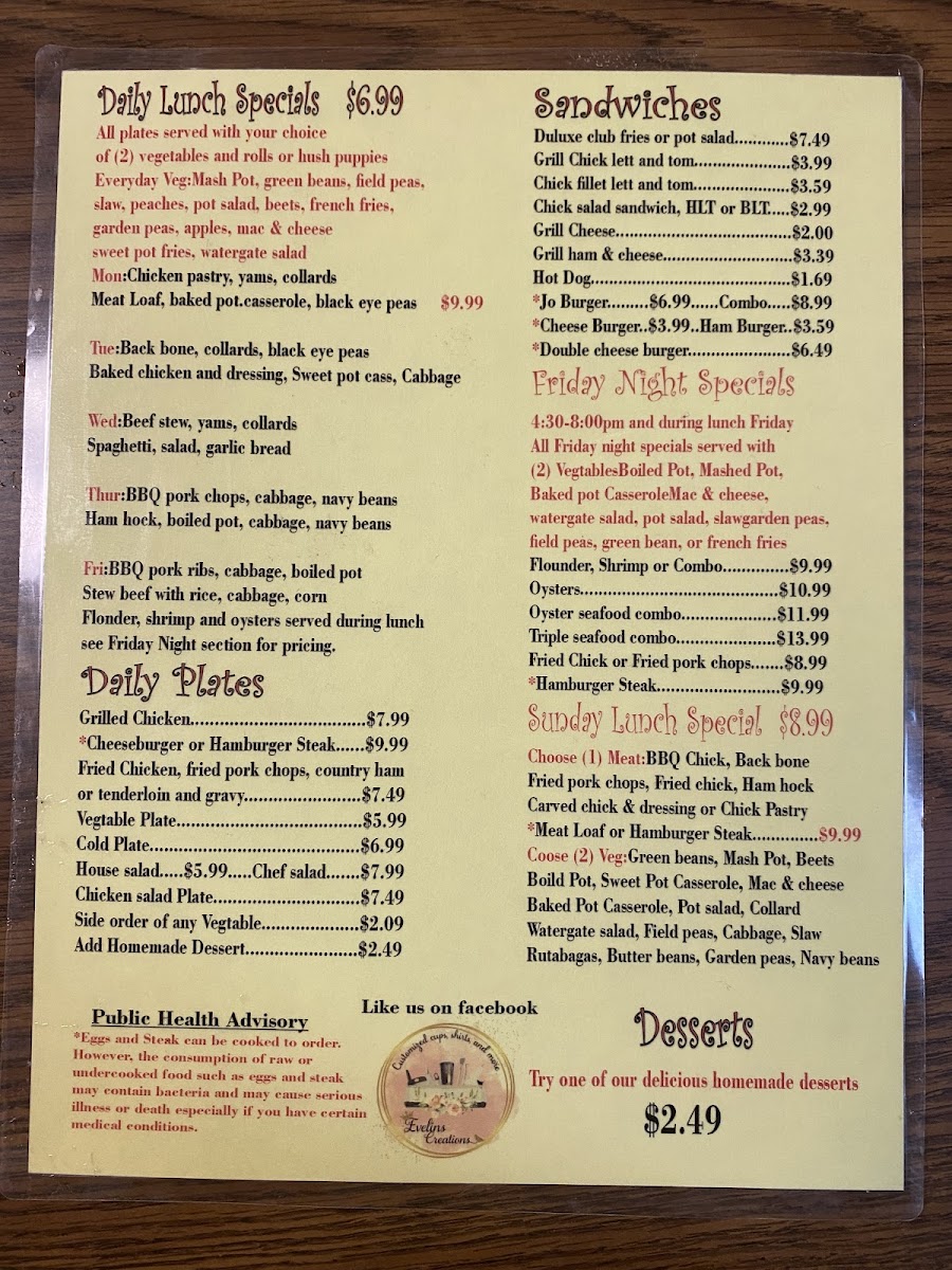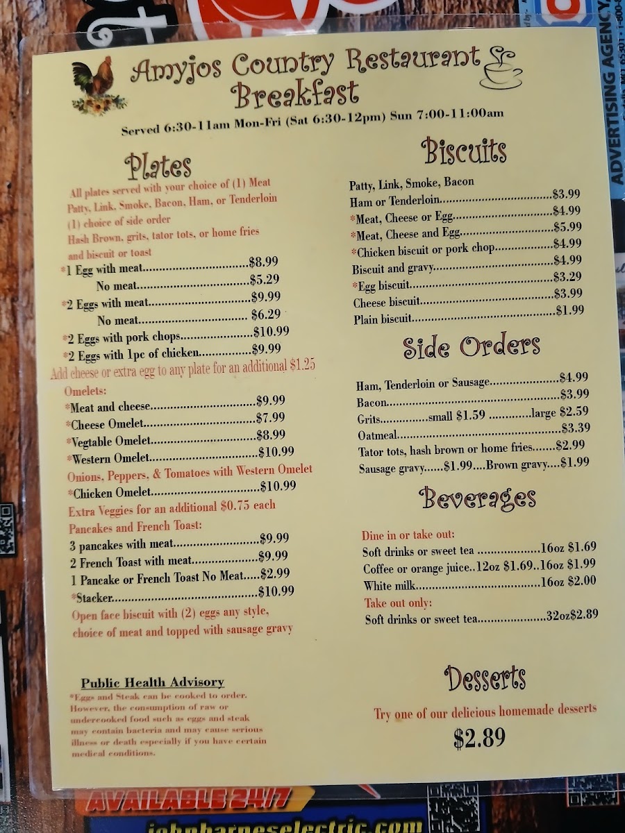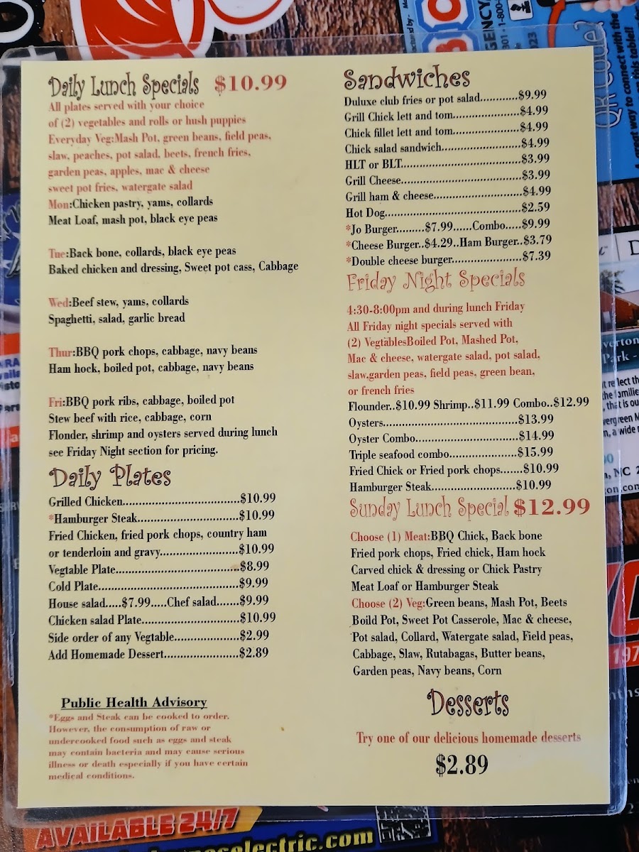 Step into Amy Jo's Country Restaurant, where comfort food comes alive with every bite! Located at 4600 Nash St N, Wilson, NC 27896, our menu is a delightful journey through classic southern flavors that promise to satisfy your cravings. Don’t miss our mouthwatering Fried Chicken, perfectly crispy on the outside and tender on the inside, or indulge in our hearty Meatloaf Dinner, complemented by creamy Mashed Potatoes and savory Gravy. For a taste of nostalgia, try our Grilled Cheese Sandwich paired with a Hoop Cheese Biscuit – it’s the ultimate combination! Whether you’re in the mood for a Fried Pork Chop Dinner, a quintessential Jo Burger with the Works, or a comforting bowl of Grits and Eggs, you’ll find something to love. And for a sweet finish, our Watergate Salad is a must-try. Come enjoy home-cooked goodness with us!